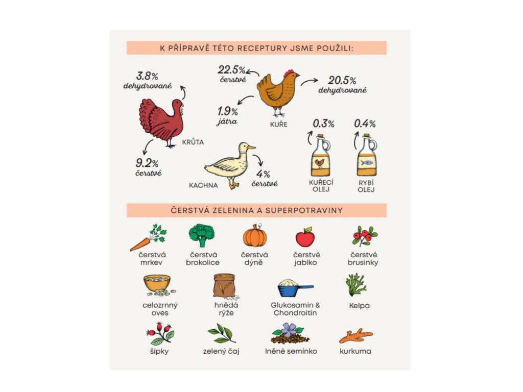 Složení: dehydrované kuřecí 20,4 %, čerstvé vykostěné kuřecí 18,7 %, celý zelený hrášek, celozrnná rýže 7,9 %, celozrnný ječmen 5,6 %, čerstvá krůtí játra 5,4 %, jablečná vláknina, čerstvá vykostěná kachna 4 %, čerstvá vykostěná krůta 3,8 %, čerstvá kuřecí játra 3,8 %, celozrnný oves 3,8 %, dehydrovaná krůta 3,8 %, rýžový protein, hydrolyzát z kuřecích jater 1,9 %, lněné semínko (přírodní zdroj mastných kyselin ω3) 0,6 %, řepné řízky, rybí olej (chráněno přírodními tokoferoly) 0,4 %, kvasnice (Saccharomyces cerevisiae), kuřecí olej (chráněno přírodními tokoferoly) 0,3 %, minerální látky, čerstvá brokolice 1000 mg/kg, čerstvá dýně 1000 mg/kg, čerstvá mrkev 1000 mg/kg, čerstvá jablka 1000 mg/kg, hydrolyzovaná buněčná stěna kvasnic (zdroj MOS) 1000 mg/kg, čekanka (zdroj FOS) 1000 mg/kg, glukosamin 500 mg/kg, výtažek z mandarinky 500 mg/ kg, chondroitin 300 mg/kg, Yucca schidigera 200 mg/kg, řasa Kelpa 30 mg/kg, klikva celé plody 30 mg/kg, šípky (bohaté na vitamín C) 30 mg/kg, zelený čaj 30 mg/kg, kurkuma 30 mg/kg.
