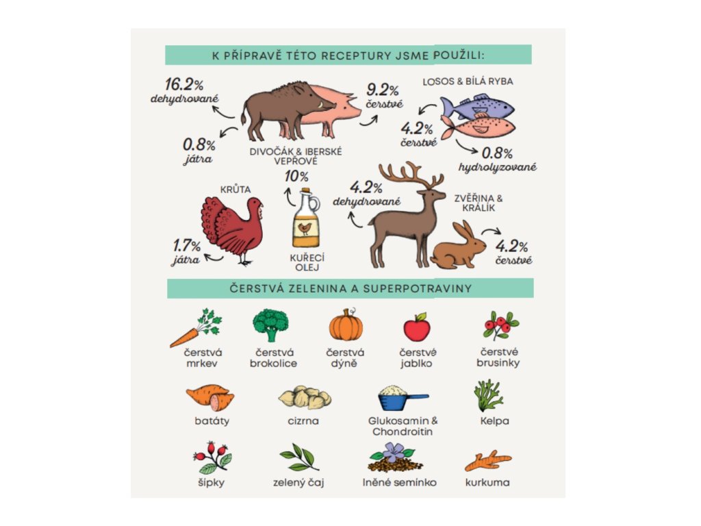 Složení: dehydrované iberské vepřové 16,2 %, dehydrované brambory, kuřecí olej (chráněno přírodními tokoferoly) 10 %, celý zelený hrášek, jablečná vláknina, čerstvé vykostěné vepřové 5 %, celý žlutý hrášek 4,3 %, dehydrovaná zvěřina 4,2 %, čerstvý losos 4,2 %, čerstvý vykostěný králík 4,2 %, čerstvý vykostěný divočák 4,2 %, celá cizrna 4,2 %, řepné řízky, dehydrované sladké brambory 2,1 %, minerální látky, hydrolyzát z krůtích jater 1,7 %, hydrolyzát z vepřových jater 0,8 %, hydrolyzát z ryb 0,8 %, lněné semínko (přírodní zdroj mastných kyselin ω3) 0,6 %, kvasnice (Saccharomyces cerevisiae), čerstvá brokolice 1000 mg/kg, čerstvá dýně 1000 mg/kg, čerstvá jablka 1000 mg/kg, čerstvá mrkev 1000 mg/kg, glukosamin 1000 mg/kg, chondroitin 600 mg/kg, hydrolyzovaná buněčná stěna kvasnic (zdroj MOS) 500 mg/kg, čekanka (zdroj FOS) 500 mg/kg, Yucca schidigera 200 mg/kg, řasa Kelpa 30 mg/kg, klikva celé plody 30 mg/kg, šípky (bohaté na vitamín C) 30 mg/kg, zelený čaj 30 mg/kg, kurkuma 30 mg/kg.