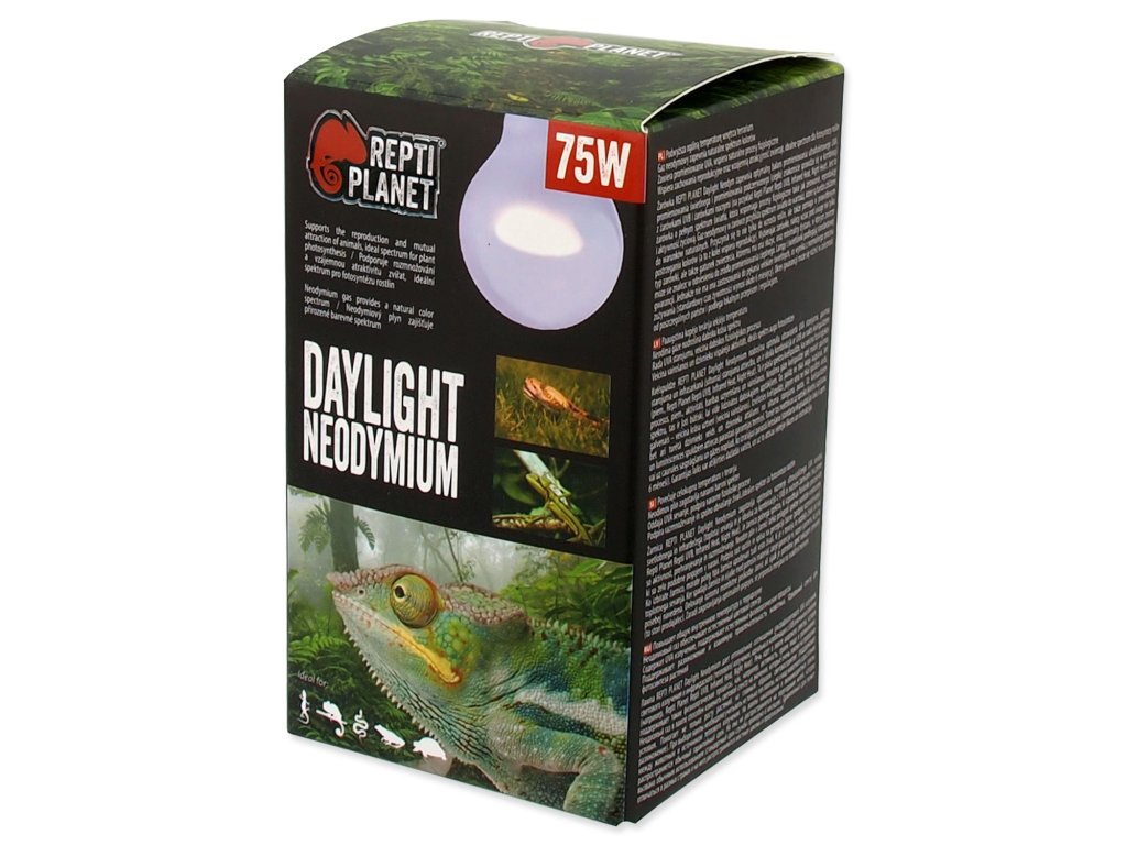 Žárovka REPTI PLANET Daylight Neodymium poskytuje optimální poměr ultrafialového UVA záření, světelného záření a infračerveného (tepelného) záření a je ideální v kombinaci s UVB a nočními žárovkami (např. Repti Planet Repti UVB, Infrared Heat, Night Heat). Jedná se o širokospektrální žárovku, která podporuje fyziologické procesy jako je např. aktivita, příjem potravy a rozmnožování. Neodymiový plyn v žárovce dokáže upravit světelné spektrum na hodnoty, které jsou velmi podobné přírodním podmínkám. Napomáhá to nejen růstu rostlin, ale především vnímání barev (podporuje rozmnožování).