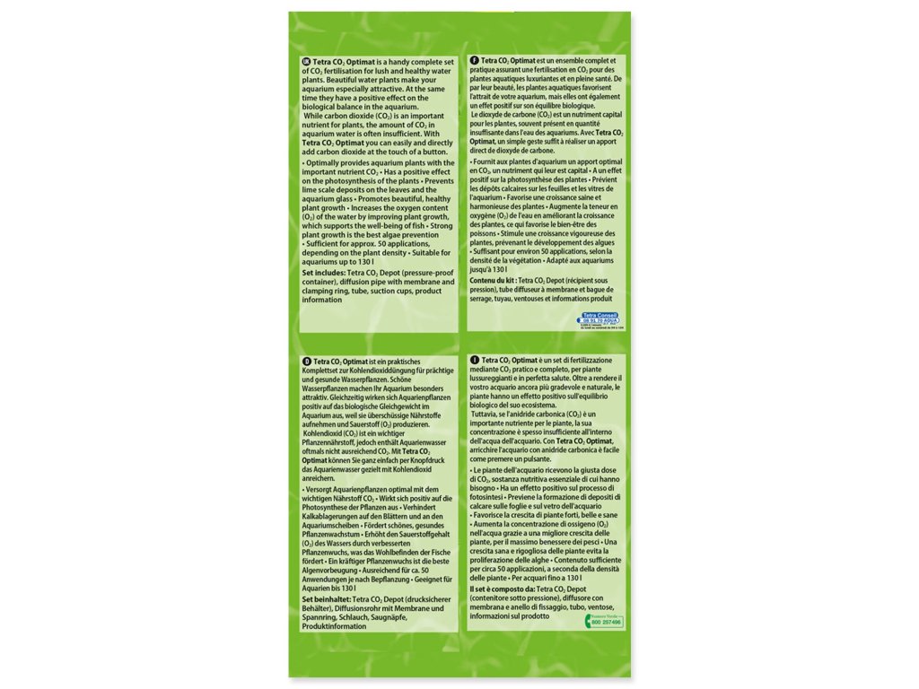 Cíleně působící systém k ošetření rostlin, jeho použití je jednoduché a bezpečné. Uhličité látky jsou důležité pro kvalitní růst akvarijních rostlin. Pečují o udržení biologické rovnováhy, zatímco se během fotosyntézy z rostlin vylučuje kyslík a kromě toho rozkládají škodlivé sloučeniny dusíku. Mimo to poskytují bujnost a zdraví vodním rostlinám a činí akvárium celkově atraktivnější. Zdravý růst rostlin je důležitý i proto, že omezuje nebezpečí růstu řas. Akvárium, ve kterém je rovnováha uhličitých kyselin stojí za námahu: